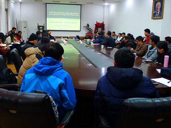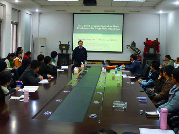 2015年1月5日上午,在肉漫 电气馆3211会议室,美国德州大学阿灵顿分校李伟仁教授应邀为肉漫 师生们带来本期“创源”大讲堂研究生学术讲座——《基于PMU的大型风电场动态等效模型研究》,此次讲座由何正友教授主持。