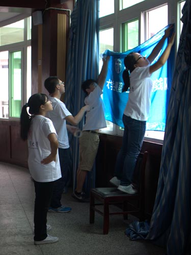上午八点,团队全体队员来到威远中学多功能厅开始讲座前的简单准备,包括贴海报、挂校旗、发放问卷等工作。此外,团队还为每一位参加讲座的同学发放了精美的纪念品——自制的书签。