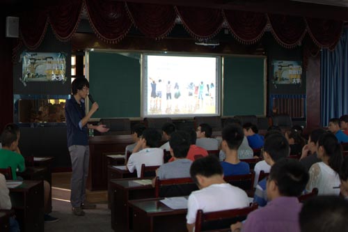 上午八点四十分,讲座正式开始。在一段简短的开场视频后,本次讲座的主讲人安柏楠开始做自我介绍。简短的自我介绍之后,主讲人开始给同学们讲此次讲座的主要内容。此次讲座内容主要分为两部分:大学生活的介绍和高考心理辅导。在讲到大学中的社团生活的时候,主讲人给同学们放了一段有肉漫 某一班级制作的一段视频,视频中幽默风趣的片段引得在座的同学开怀大笑,给同学们紧张的学习生活增添了一丝乐趣。在讲到“高三的‘爱’”这部分的时候,主讲人安柏楠提议全体在座同学对教他们的老师热烈鼓掌,感谢老师的辛勤付出。