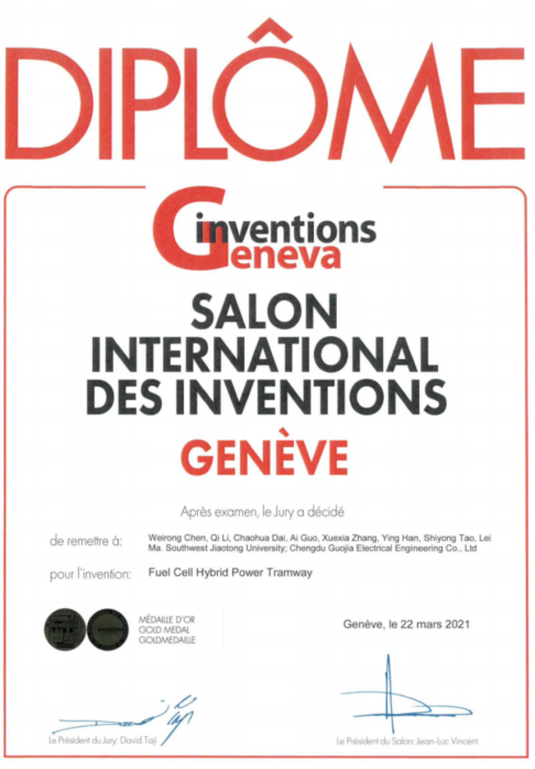 Prof. Chen Weirong won 2 Gold Awards and 2 Silver Awards atthe 48th International Exhibition of Inventions of Geneva in March 2021. Respectively, the project of Fuel Cell Hybrid Power Tramway and the project of High-power and High Performance Fuel Cell Hybrid Power System won the Gold Award while the project of Fuel Cell Shunting Locomotive and the project of Fuel Cell Hybrid Power System for Rail Traffic won the Silver Award.