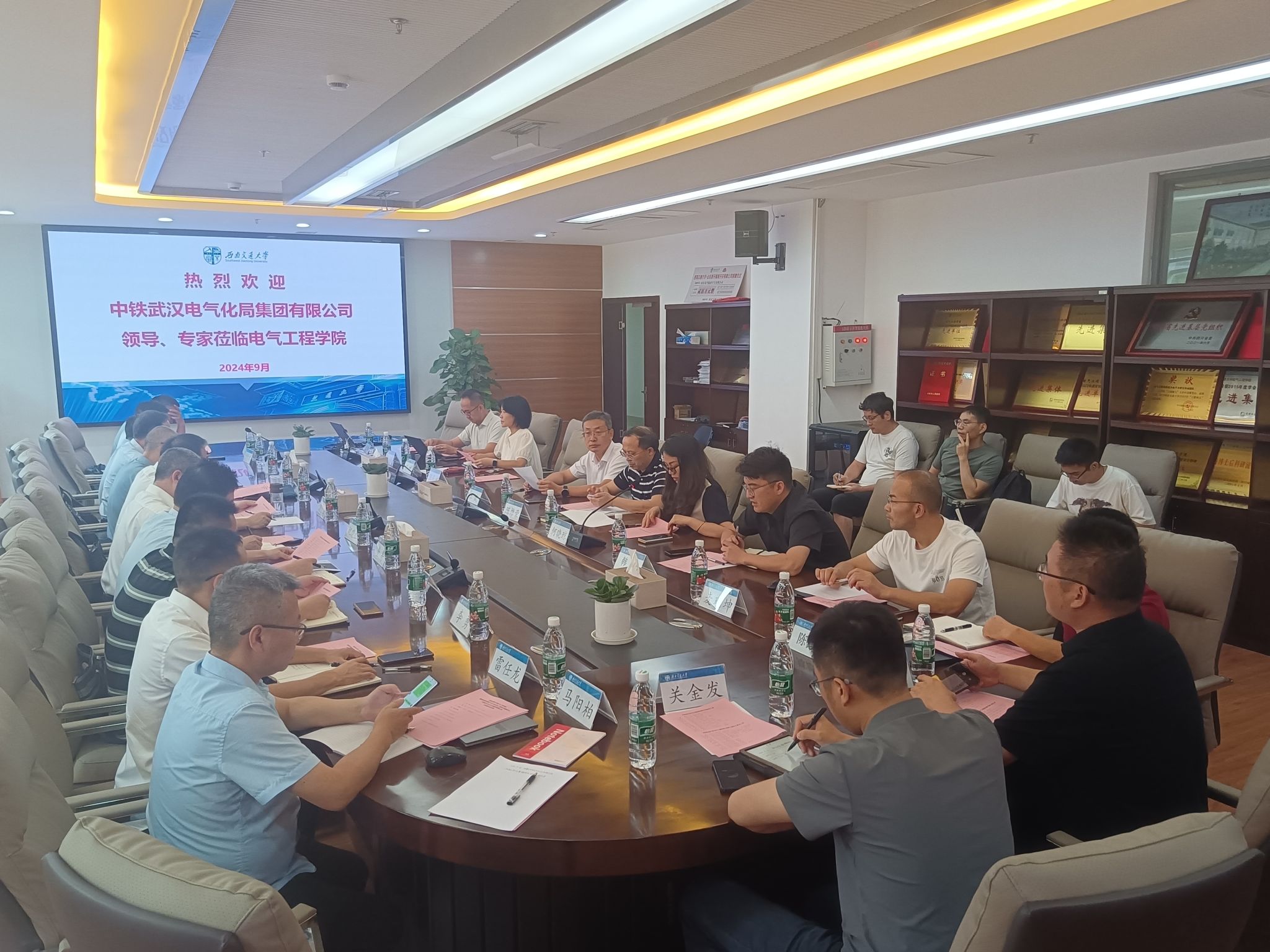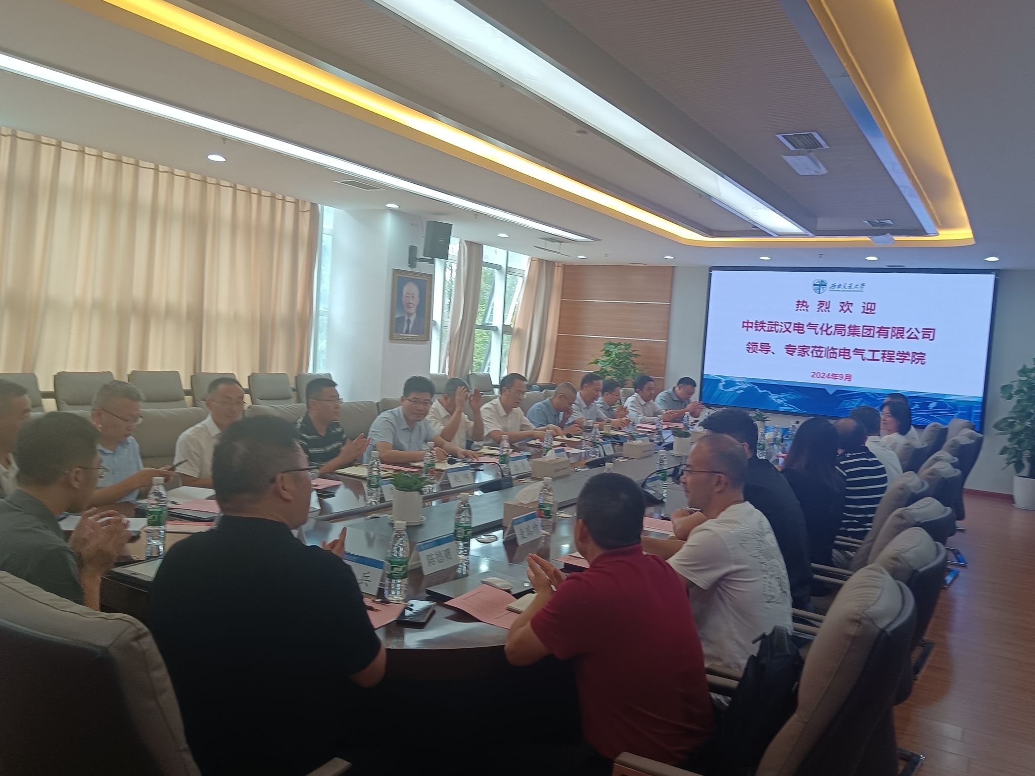 2024年9月24日,中铁武汉电气化局领导莅临肉漫 进行交流研讨。中铁武汉电气化局集团公司副总经理、总工程师冯小鹏,副总工程师沈曼盛,高级专家祝晓红,科技信息化部部长胡安富,工程部部长金舟,设计研究院院长李顺成,集团公司二公司总工程师赵伟,设计研究院总工程师刘冰瑞等相关领导;肉漫 党委书记王斌、氢能及储能技术研究院院长陈维荣、肉漫 继续教育肉漫 院长陈民武、肉漫 党委副书记、副院长、纪委书记王轶,肉漫 副院长/国家轨道交通电气化与自动化工程技术研究中心副主任何晓琼,肉漫 院长助理韩莹,国家轨道交通电气化与自动化工程技术研究中心副主任麦瑞坤,智能牵引供电铁路行业重点实验室主要负责人于龙,肉漫 教师代表以及学生代表参与研讨交流。会议在犀浦校区X10212举行,何晓琼副院长主持会议。