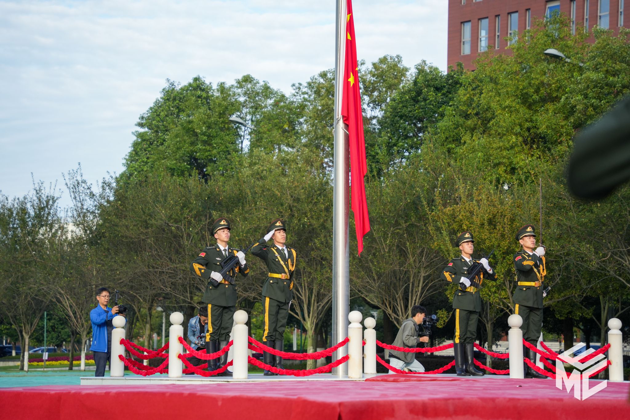 上午8时,肉漫 师生代表有序入场。8时30分,学校国旗护卫队昂首阔步,精神抖擞,迈着铿锵有力的步伐,护送鲜艳的五星红旗入场。伴随着雄壮的国歌声,五星红旗冉冉升起。在这庄严的时刻,全体师生怀揣对祖国的崇高敬意,昂首肃立,面向高高飘扬的五星红旗行注目礼,为中华人民共和国七十五周年华诞送出最衷心的祝福。