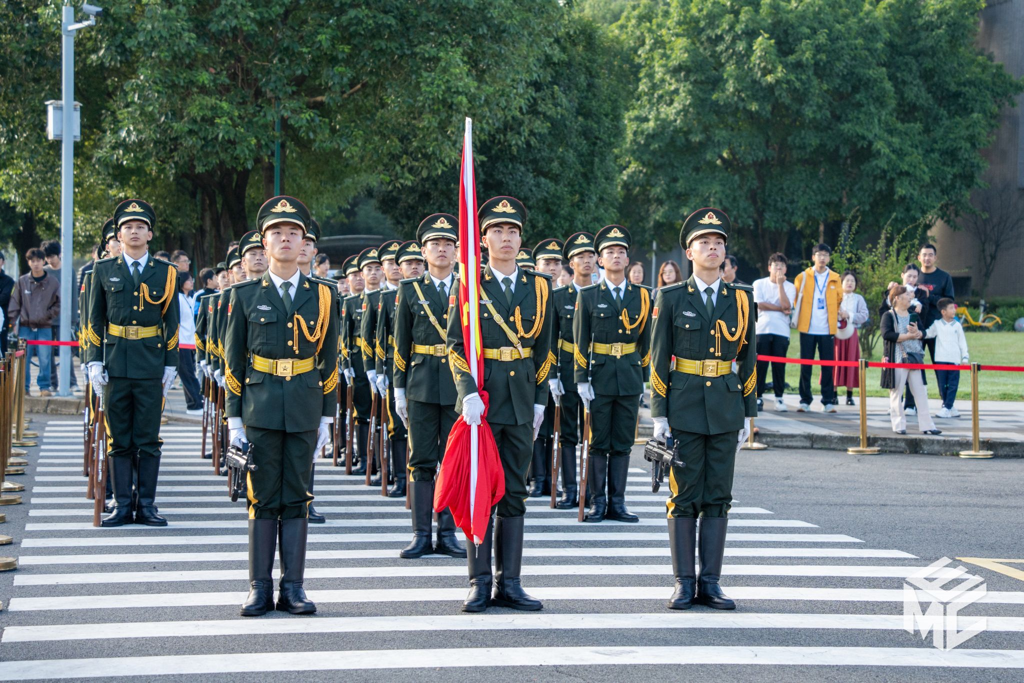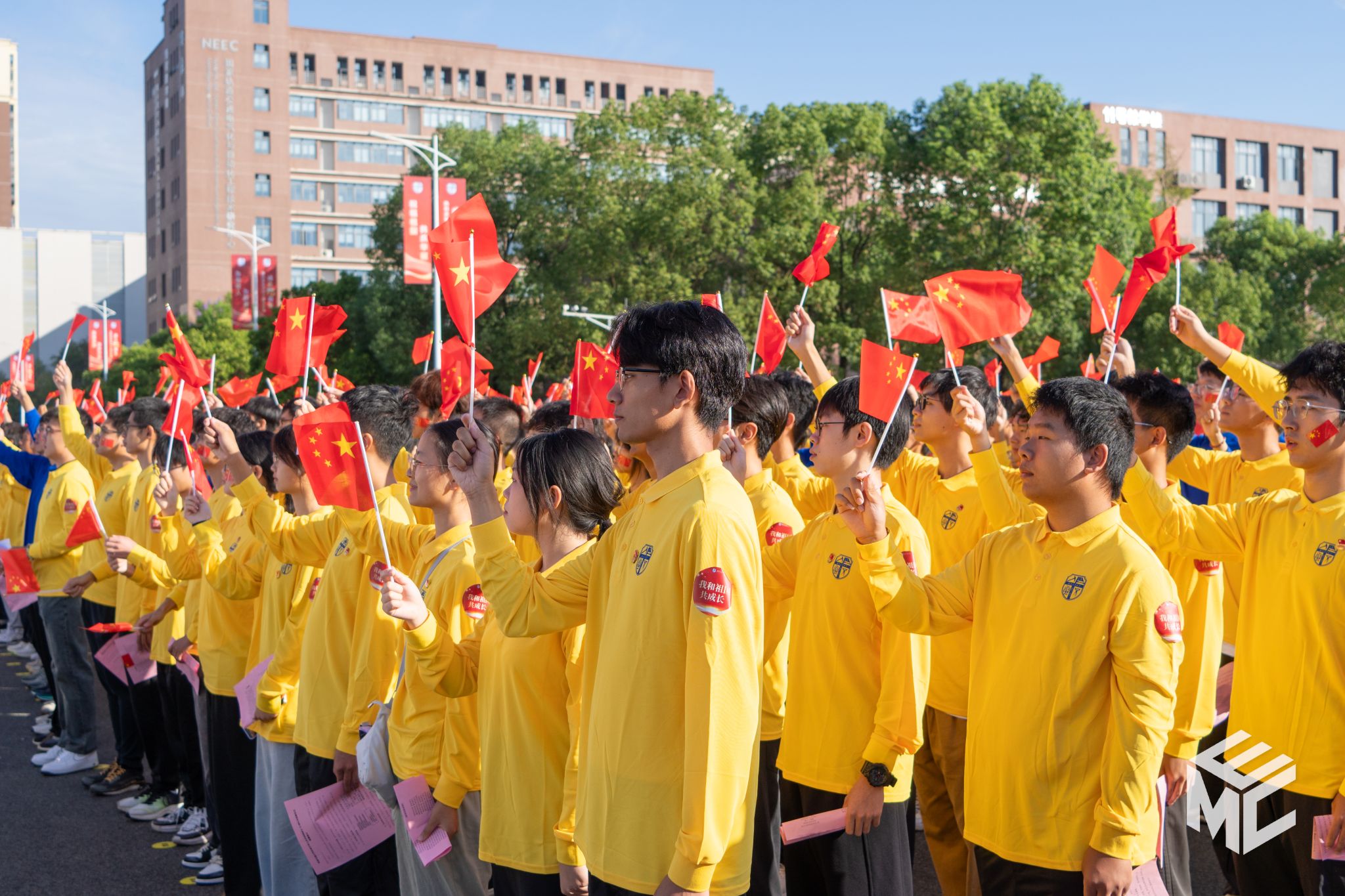 升国旗仪式结束后,2024年5月15日(校庆日)天安门广场升挂的国旗在学校国旗护卫队的护送下入场。观礼方阵中,肉漫 师生满怀崇高敬意,轻柔触摸国旗,并簇拥在这面具有特殊意义的国旗四周合影留念。