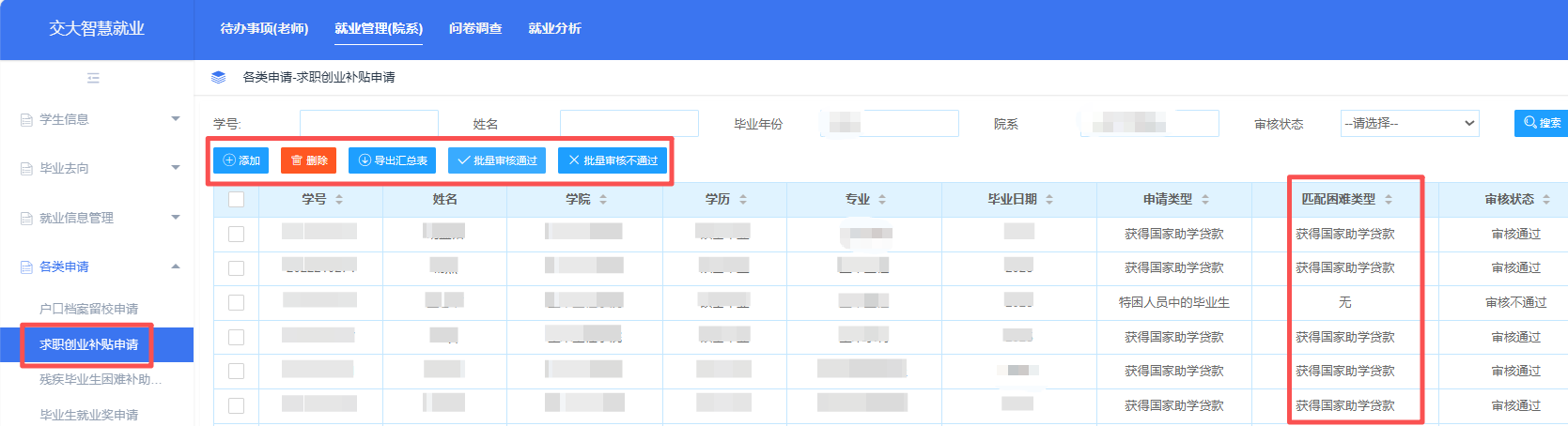 2.核对申请求职补贴的学生名单,并在智慧就业网导出《xx肉漫 符合补贴要求无需提供证明材料学生明细表》(附件3)和《xx肉漫 符合补贴要求需要提供证明材料学生明细表》(附件4),填写《肉漫 求职补贴申请汇总表》(附件5)。